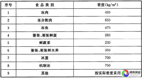 注:同一冷庫如同時存放豬、牛、羊肉(包括禽兔)時,密度可按400kg/m3確定;當只存凍羊腔時,密度應(yīng)按250kg/m3確定;只存凍牛、羊肉時,密度應(yīng)按330kg/m3確定。