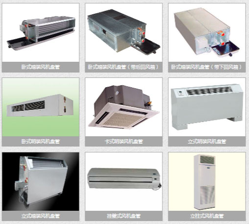 中央空調末端設備有很多,主要有:各式風機盤管(立式明裝風機盤管、臥式暗裝風機盤管,壁掛式風機盤管,立柜式風機盤管,臥式明裝風機盤管),變風量空氣處理機組(新風機)、新風換氣機(窗式新風換氣機、壁掛式新風換氣機,落地式新風換氣機),組合式空調器、冷卻塔、溫控開關、水流控制閥(二通閥)、風閥等。